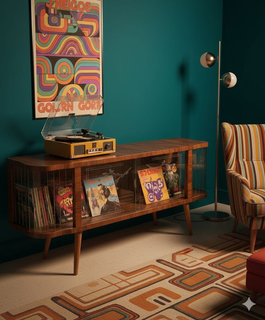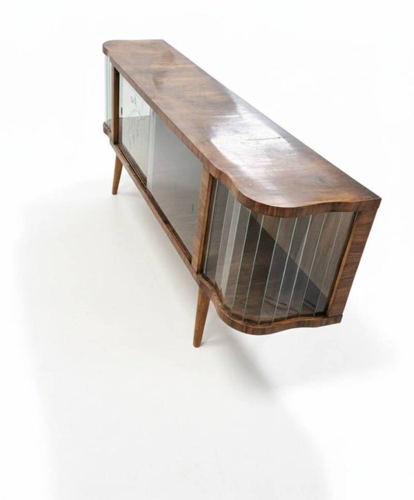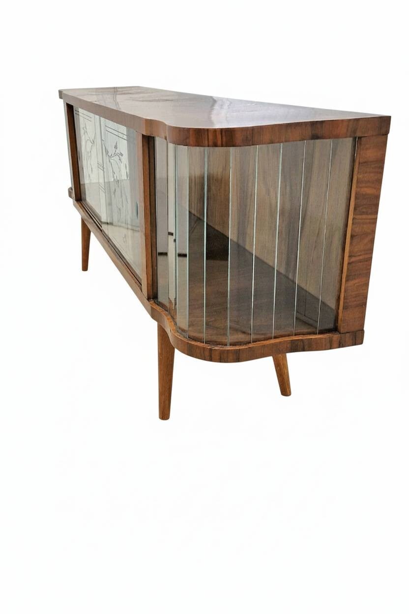 Deze originele vitrinekast uit de jaren ’60 is een prachtig voorbeeld van Mid-Century design. Het elegante silhouet, gebogen glas aan de zijkanten en de subtiel gegraveerde bloemmotieven op de schuifdeuren geven het meubel een stijlvolle en bijzondere uitstraling.