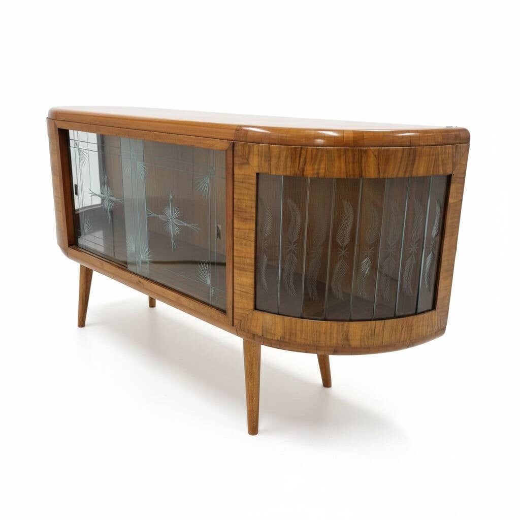 Originele Jaren 60 Vitrinekast – Retro Boho Te koop: een unieke, originele vitrinekast uit de jaren 60 in Mid-Century Modern stijl. Dit meubel verkeert in authentieke staat, is nooit gerestaureerd en heeft een prachtige natuurlijke patina die zorgt voor een doorleefd karakter.In het kort:Subtiel en licht: Dankzij de ronde vormen en slanke pootjes oogt de kast heel luchtig in je interieur.Originele details: Glazen zijkanten en voorkant versierd met een subtiel gegraveerd sterren- en verenmotief.Authentieke staat: De kast heeft lichte gebruikssporen (patina), wat hem perfect maakt voor liefhebbers van echt vintage of boho