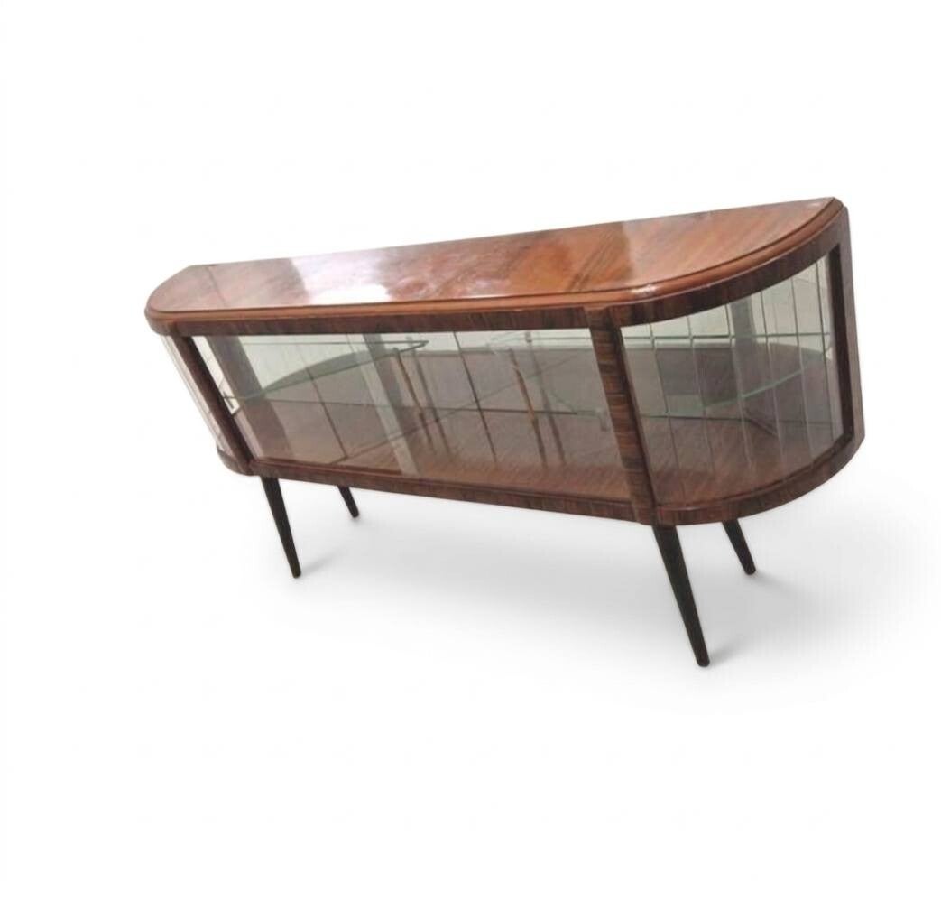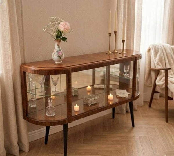 Unieke Handgeschilderde Vintage Vitrinekast – Jaren '60/'70 HoutnerfschilderenTe koop: een werkelijk unieke, glazen vitrinekast met een prachtige ronde vorm. Dit meubel is de perfecte belichaming van het mid-century modern design en een absolute zeldzaamheid op de markt.Wat maakt dit meubel zo bijzonder? (Mazerunek)Deze vitrinekast is afgewerkt met de "mazerunek" techniek – een zeer zeldzame en ambachtelijke methode van handgeschilderde houtimitatie. Een vakman heeft hierbij handmatig de nerven van kostbaar hout nageschilderd.