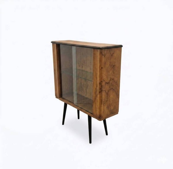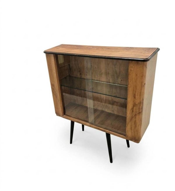 Te koop: een prachtige, karakteristieke vitrinekast uit de jaren 50 60.Dit meubel combineert de warme uitstraling van natuurlijk hout met een stoer modern accent door de strakke zwarte poten.Een tijdloos item dat perfect past in zowel een vintage als een industrieel interieur.Kenmerken:Authentiek Design: Strakke, geometrische vorm met een prachtige houtnerf op de panelen.Modern Accent: Voorzien van elegante zwarte poten ("tapered legs") die het meubel een zwevend en modern effect geven.Glaswerk: Twee glazen schuifdeuren en een glazen legplank binnenin. Ideaal om uw mooiste servies, boeken of verzameling stofvrij te presenteren.Veelzijdig: Perfect te gebruiken als stijlvolle drankkast (bar), dressoir of pronkkastje.Conditie:De kast verkeert in een nette vintage staat met normale ouderdomssporen die bijdragen aan het unieke karakter van het meubel. De constructie is stevig en het glas is volledig intact.Afmetingen L98 B 30.50 H 120Vraagprijs: 395€